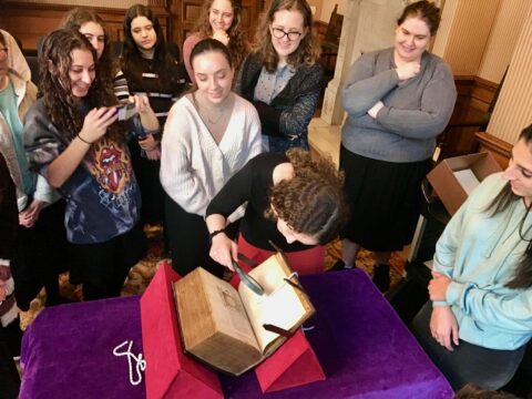 Several illuminated Bibles in Latin, French and English were also viewed, including an exceptionally rare illuminated Hebrew Bible in its original 15th-century goatskin binding. With the aid of a magnifying glass, students were able to read the name of the scribe, Simon ben Rabbi Samuel (Astruc Samiel d'Ascola), who signed his name and dated the manuscript completed in 1422 in Provence, France. In examining the miniatures that adorned many manuscripts, students were struck by anachronistic artistic choices, such as classical architecture and ruins in the background of the scenes portraying Solomon's judgment of the two women at his palace (1 Kings 3) and the Queen of Sheba's visit to Jerusalem (1 Kings 10). In addition to seeing the use of precious materials to highlight the importance of the text, students learned about the role of art in devotional and liturgical works. Artists often overlooked historical accuracy in favor of contemporary dress and neoclassical settings as means to make the stories of the bible feel more immediate for their intended audiences.